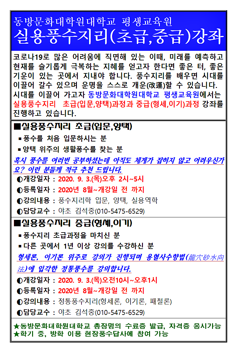 실용풍수지리(초급,중급)수강생 모집-동방문화대학원대학교 평생교육원답사,강의알림방/공지사항 2020. 8. 9. 20:09