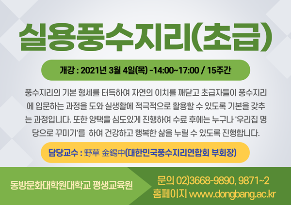 (동방문화대학원대학교 평생교육원)2021-1학기 풍수지리반 모집(초급,중급,부동산경매풍수)