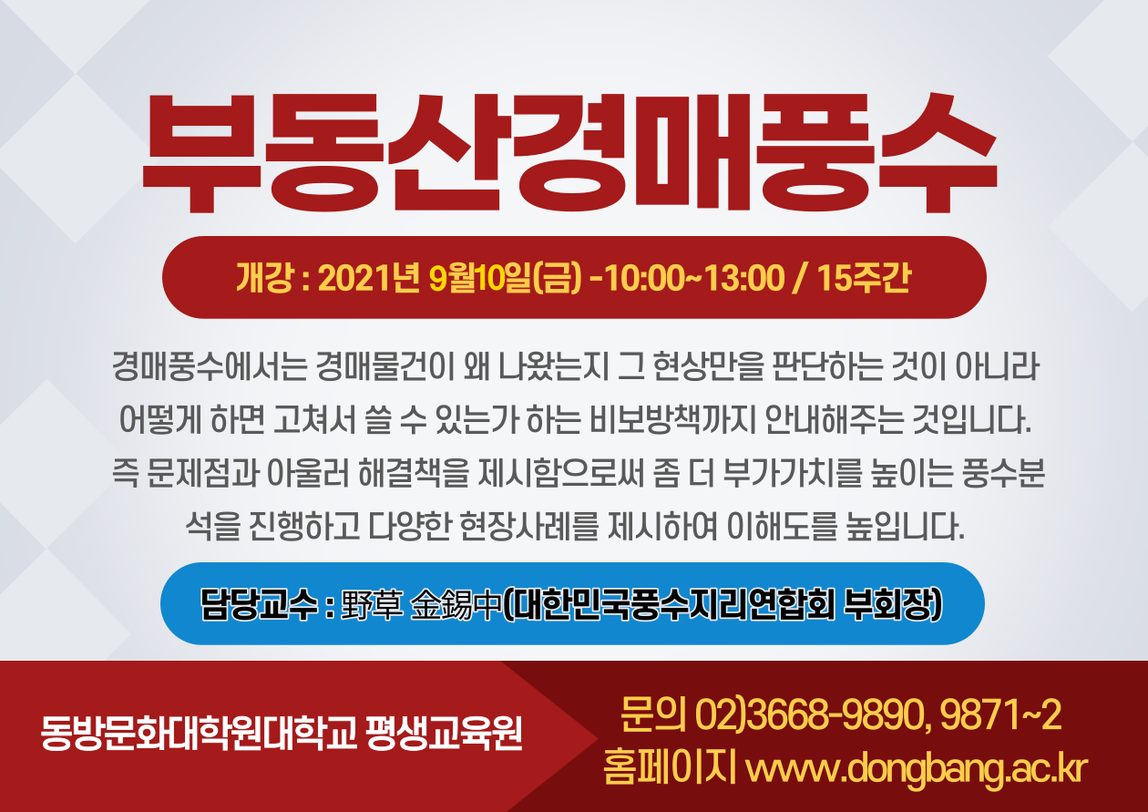 (동방문화대학원대학교 평생교육원)2021-2학기 풍수지리반 모집(초급,중급,부동산경매풍수)