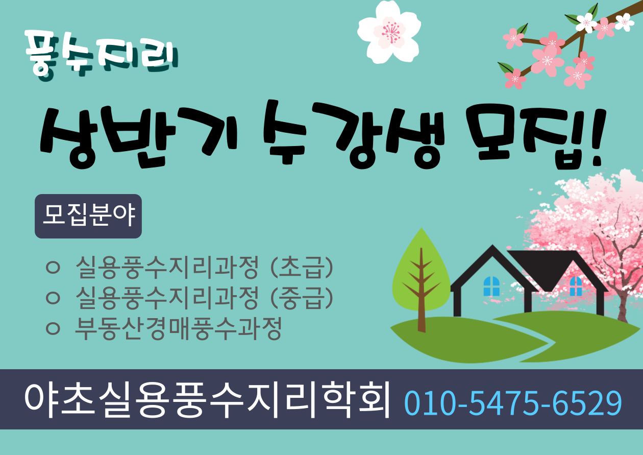 비대면 온라인(ZOOM) 생활풍수 강의 수강신청 안내(성북평생학습관) (0) 2022.04.25 (의정부시평생학습원)현대생활풍수 수강생 모집(4월6일 개강 전까지 등록가능) (0) 2022.03.17 비대면 온라인(ZOOM) 생활풍수 강의 수강신청 안내 (0) 2022.01.26 (동방문화대학원대학교 평생교육원)2021-2학기 풍수지리반 모집(초급,중급,경매풍수) (0) 2021.08.08 (수강생 모집)택일법 특강(6.24. 09시 개강, 4주,매주 목) (0) 2021.06.16