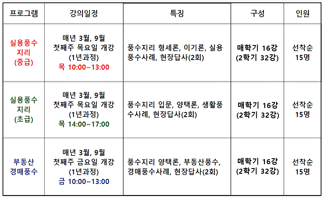 매주 목요일, 금요일에 진행하는 풍수지리 강좌에 많은 참여 바랍니다.