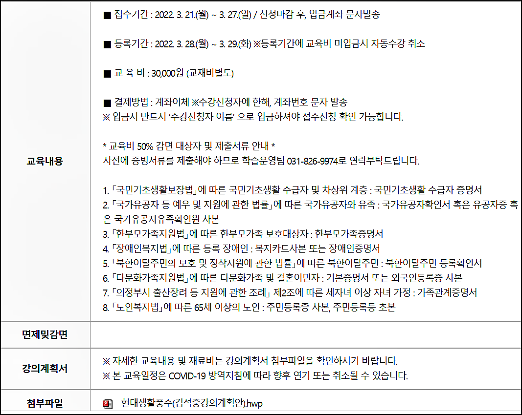 ❍ 교육일정 : 2022. 4. 6. ~ 6. 22.(수) 오전 10:00~12:00 (4월6일 개강 전까지 등록가능)