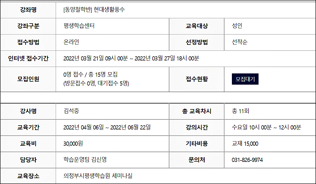 이번에 의정부시 평생학습원에서 대면 강좌로 생활풍수 과정을 개설했습니다.