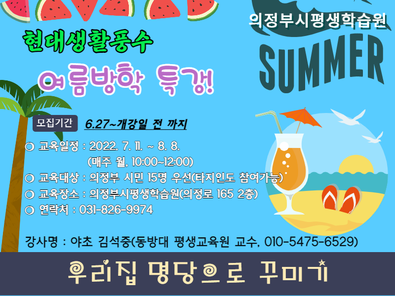 (의정부시평생학습원)현대생활풍수 여름방학특강 수강생 모집카테고리 없음 2022. 6. 14. 18:15