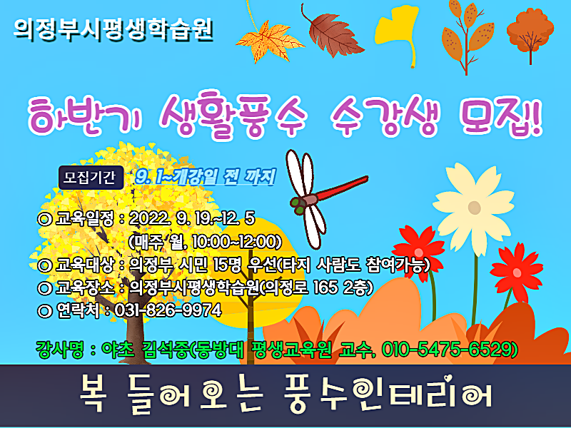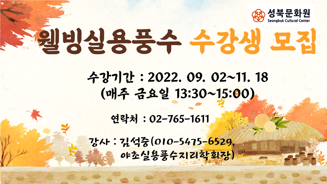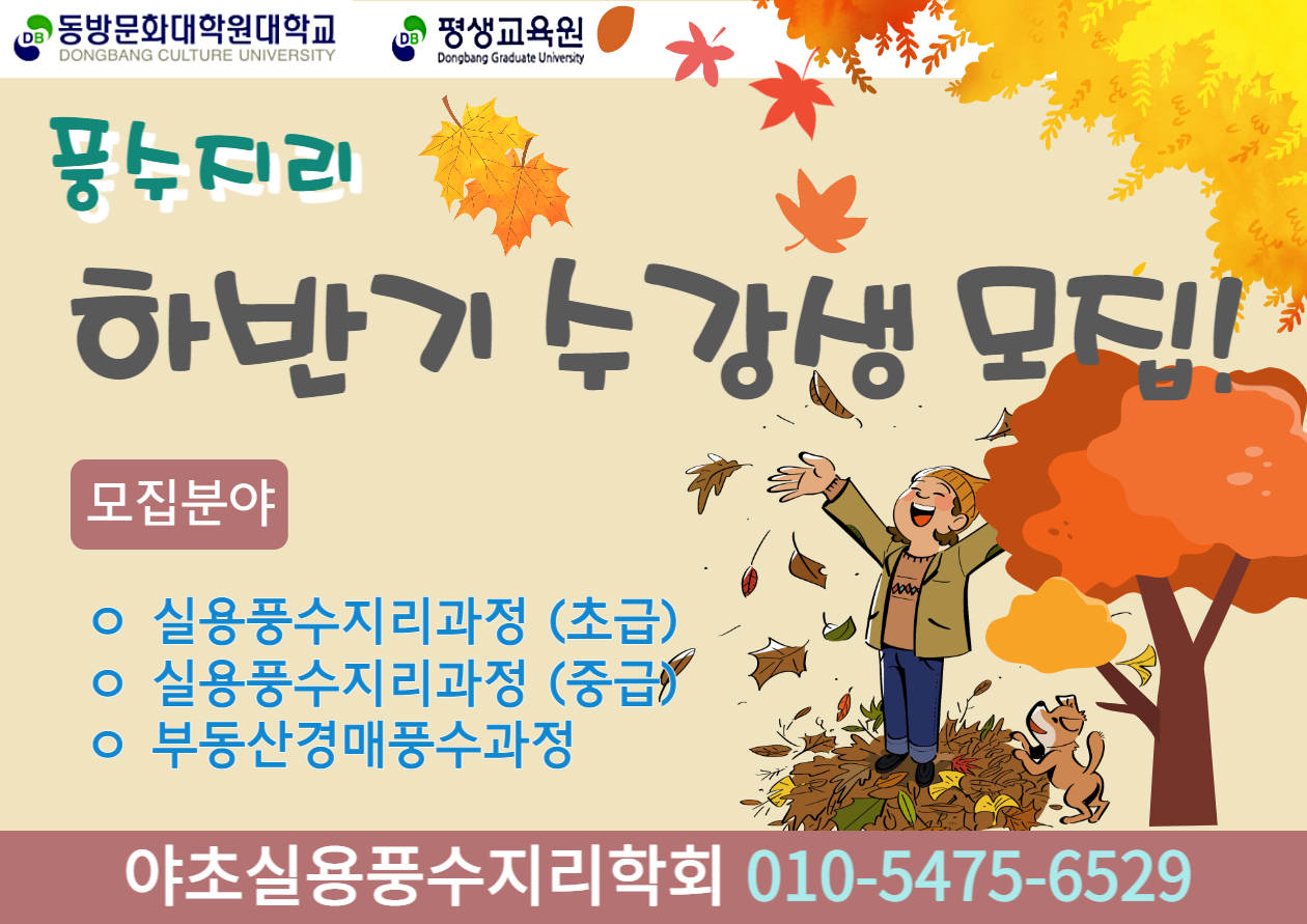 야초실용풍수지리학회 하반기 강의 안내 1.성북문화원(문의 02-765-1611) ㅇ수강과목: 웰빙실용풍수 ㅇ접수기간: 2022년 8월 부터 ~ 개강 전 까지 ㅇ교육일시: 2022. 9. 2(금)~11.18(금)(매주 금요일 13:30~15:00) ㅇ교육장소: 서울 성북구 성북로4길 13-8 (동소문동1가 1번지) ㅇ신청방법: 인터넷 접수 및 방문 접수(전화접수 불가) ㅇ인터넷주소: https://www.isbcc.or.kr/program/course-guide 수강신청 바로가기 2.성북구평생학습관(문의 02-2241-2420) ㅇ프로그램명: 9.복을 부르는 풍수인테리어 : 생활풍수 ㅇ접수기간 : 2022.08.22 10시 ~ 09.05 10시 ㅇ교육일시 : 2022.09.28 ~ 11.16 (매주 수요일 14:00 ~ 16:00) ㅇ교육장소 : 성북구 종암로 167 동일하이빌뉴시티 상가동 3층 ㅇ신청방법 : 인터넷, 전화 접수 및 방문 접수 ㅇ인터넷주소: https://www.sb.go.kr/edu/reservation/learning/education/educationProgram.do?resgrpseqn=2014&menuNo=05000000&subMenuNo=05030000 수강신청 바로가기 3.의정부시평생학습원(문의 031-826-9974) ㅇ수강과목 : 생활풍수 ㅇ접수기간 : 2022. 9. 1 ~ 개강전 까지 ㅇ교육일시 : 2022. 9.19~12.5 (매주 월요일 10:00~ 12:00) ㅇ교육장소 : 의정부시평생학습원(의정로 165) ㅇ신청방법 : 인터넷, 전화 접수 및 방문 접수 ㅇ인터넷주소: https://www.ull.or.kr/lifeedu/index.do 수강신청 바로가기 4.동방대 평생교육원(02-3668-9890) ㅇ수강과목 : 실용풍수 초,중급, 부동산경매풍수 ㅇ접수기간 : 2022.08. ~ 09.15 10시 ㅇ교육일시 : ·실용풍수 초급 2022.09.15 ~ 12.22 (매주 목요일 14:00 ~ 16:30) ·실용풍수 중급 2022.09.15 ~ 12.22 (매주 목요일 10:00 ~ 12:30) ·부동산경매풍수 2022.09.16 ~ 12.23 (매주 금요일 10:00 ~ 12:30) ㅇ신청방법: 인터넷, 전화 접수 및 방문 접수(02-3668-9890) ㅇ인터넷주소: https://www.dongbang.ac.kr/graduateUniv/html/education/register_info.php 수강신청 바로가기
