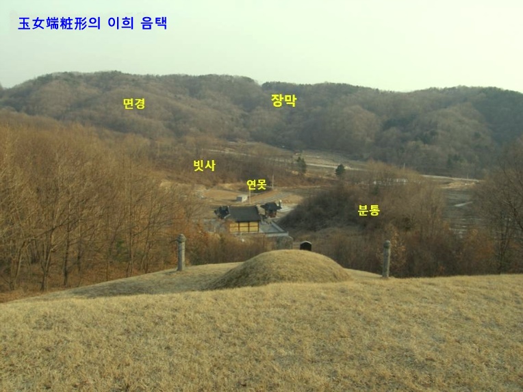 이곳 묘소는 보국(保局)이 완벽한 장풍국(藏風局)의 명당을 이루는데, 탐랑체(貪狼體) 주봉(主峰)에서 낙맥(落脈)하는 내룡(來龍)의 기세가 활발하다. 입수처에서 살짝 고개를 쳐들고 비룡(飛龍)으로 치올라 옥녀단장형(玉女端粧形)의 형국을 일구었다.