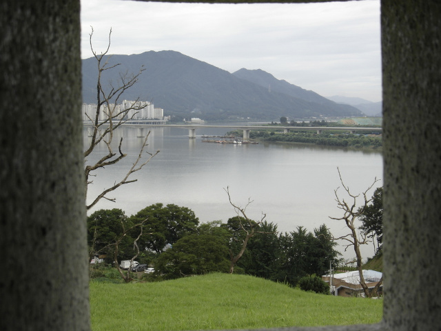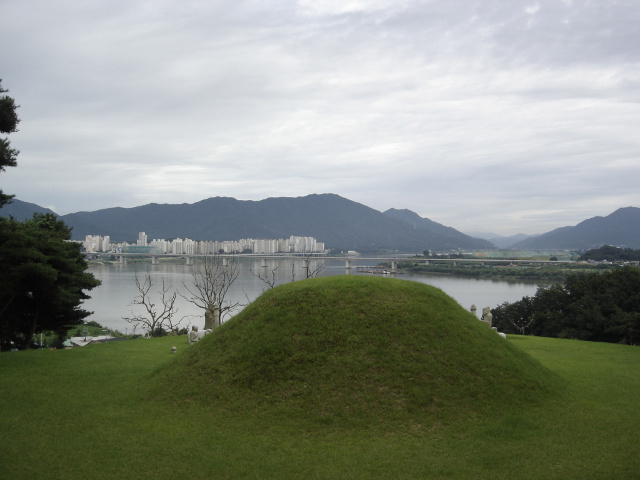 한강물이 묘앞으로 밀고 들어오고 있다. 소낙비가 오락가락한 날씨였지만 답사에는 큰 무리가 없었다.