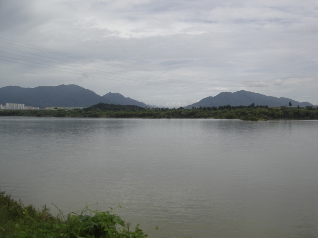 미음나루에서 팔당쪽을 바라본 전경.. 가운데 움푹 파인 곳이 팔당.. 왼쪽산이 예봉산, 우측은 검단산.